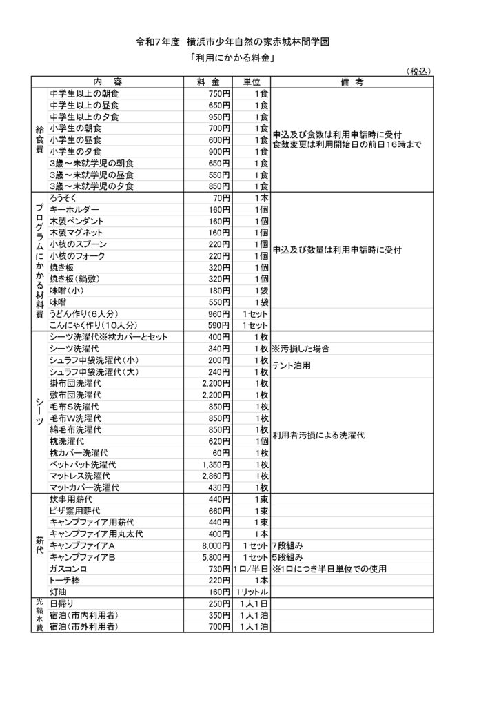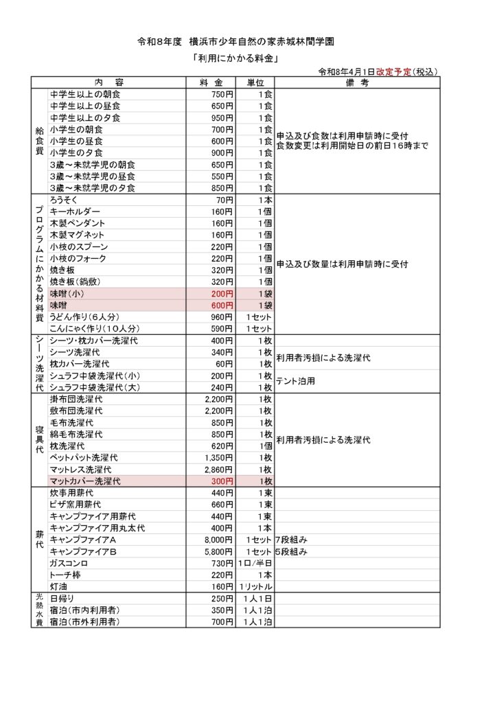 令和7年度、令和8年度利用料金の変更について 2026 1/19 PICK UP お知らせ 令和8年4月1日より赤城林間学園の利用料金を変更する予定です。詳細は下記の変更予定料金表をご覧ください。赤字部分が変更になる箇所です。 令和8年度 利用料金変更予定 令和7年度 利用料金 キャンプ(キャンドル)ファイアー及び一般販売品 令和8年4月1日より 木炭 3kg 600円 → 660円 PICK UP お知らせ