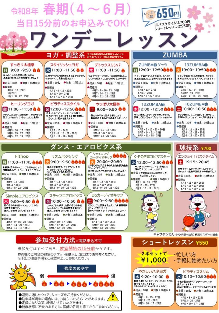 【日程表】春のワンデーレッスン 2026 3/24 PICK UP お知らせ ワンデーレッスン 春(R8.4~6月)のワンデーレッスン! 参加方法はこちら PICK UP お知らせ ワンデーレッスン ※ 注意事項 ・受付時間から先着定員制です。定員を超えた時点で、受付を終了させていただきます。・運動できる服装と室内シューズをお持ちください。 ※マットの上で行う教室は室内シューズは要りません。・受付された方以外は安全管理上入室できません。・妊娠されている方はご参加できません。