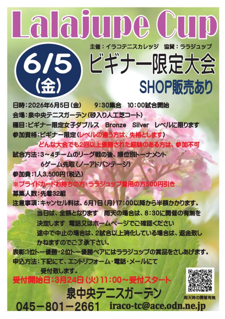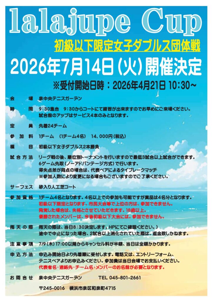 レディース1Day大会 団体戦・個人戦 2026 4/14 PICK UP イベント 大会 ララジュップ個人戦 2026 KEA CUP ララジュップ 団体戦 7月 ララジュップ 個人戦 7月 お申込みはこちらから 団体戦用 個人戦用 PICK UP イベント 大会
