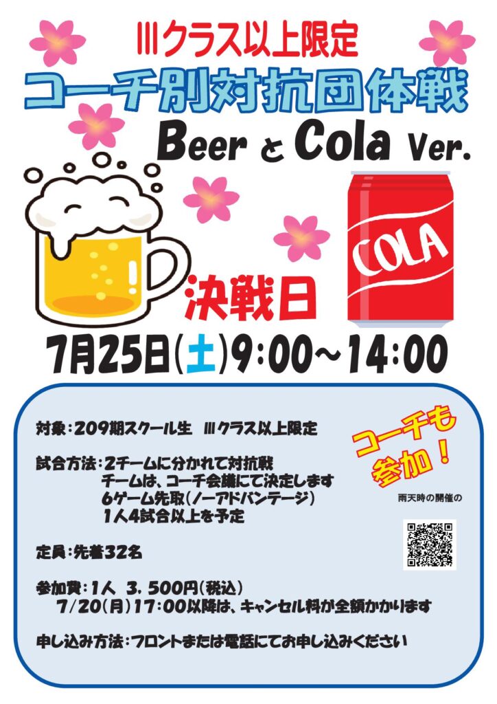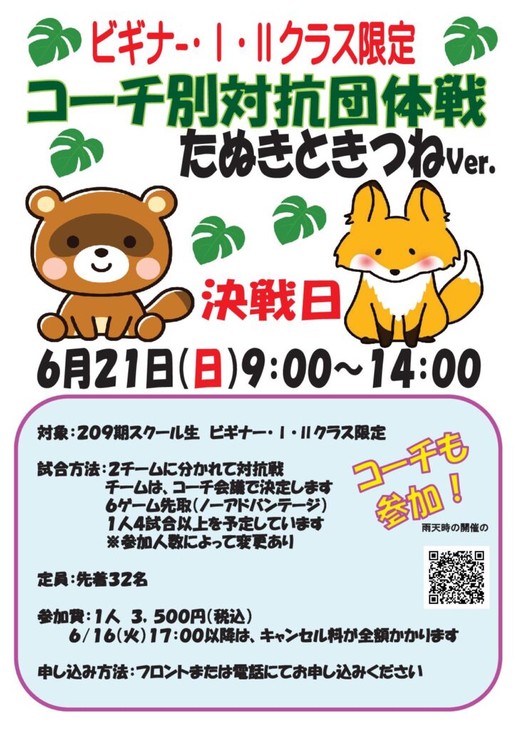 特別レッスン・イベント(テーマ・振替・など) 2026 3/31 PICK UP イベント お知らせ スクール フロントまたはお電話にてお申込みください 写真をクリックすると拡大できます 4月テーマレッスン(特別企画)&新設レッスン テーマ4月 3月のテーマレッスン 追加レッスン 追加レッスン 土曜女子4・5月 土曜女子クラス 4・5月更新 お申込みはこちらから スクール生イベント 2026春ハーフデーキャンプ Half Day Camp 2026GWダブルスゲーム練習会 たぬきときつね対抗戦 たぬきときつねの対抗戦 ビールとコーラ対抗戦 ビールとコーラの対抗戦 PICK UP イベント お知らせ スクール