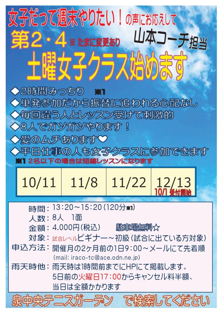 各コーチ 特別レッスン&練習会のご案内 10.12月分更新 2025 9/19 PICK UP イベント お知らせ クリックすると大きく見えます★ 各種お申込みの際は「〇〇コーチの」とご連絡ください 10~12月分更新 10-12 お申込みはメールで iraco-tc@ace.odn.ne.jp 前田コーチ 7.8.9月 前田コーチ 練習会 各コーチ特別レッスン 10-12 お申込みはメールで iraco-tc@ace.odn.ne.jp 女子ダブルス練12-1月 山本コーチ 練習会 10~11月 前田コーチ練習会 前田C水曜午後 前田コーチ練習会 清水Cショットレッスン PICK UP イベント お知らせ