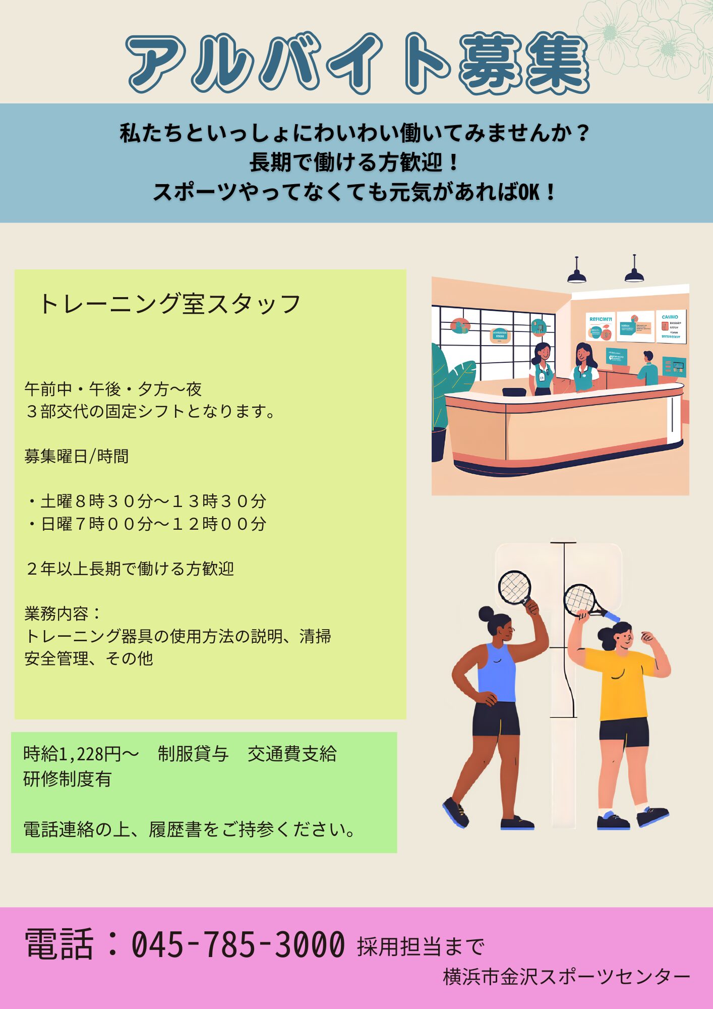 【急募】アルバイト募集!(1月27日更新) 2026 1/27 PICK UP お知らせ トレーニング室 アルバイト募集します わたしたちと一緒に働きませんか? スポーツ得意じゃなくていいです!元気があれば大丈夫! 先輩スタッフがやさしく教えてくれますよ♪ まずはお気軽にお問い合わせください(^^)/ PICK UP お知らせ