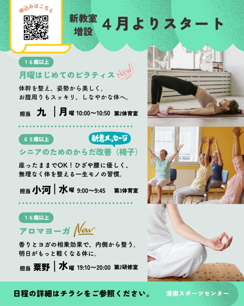🌸この春、新しい自分に出会うチャンス!🌸 4月から始まる春の定期教室に、待望の【新クラス】が仲間入り! 「ちょっと気になる」「何か始めてみたい」そんなあなたにぴったりのプログラムが勢ぞろい。 心も体も軽やかに、春の一歩を踏み出してみませんか? 初心者さんも大歓迎!お気軽にご参加ください♪