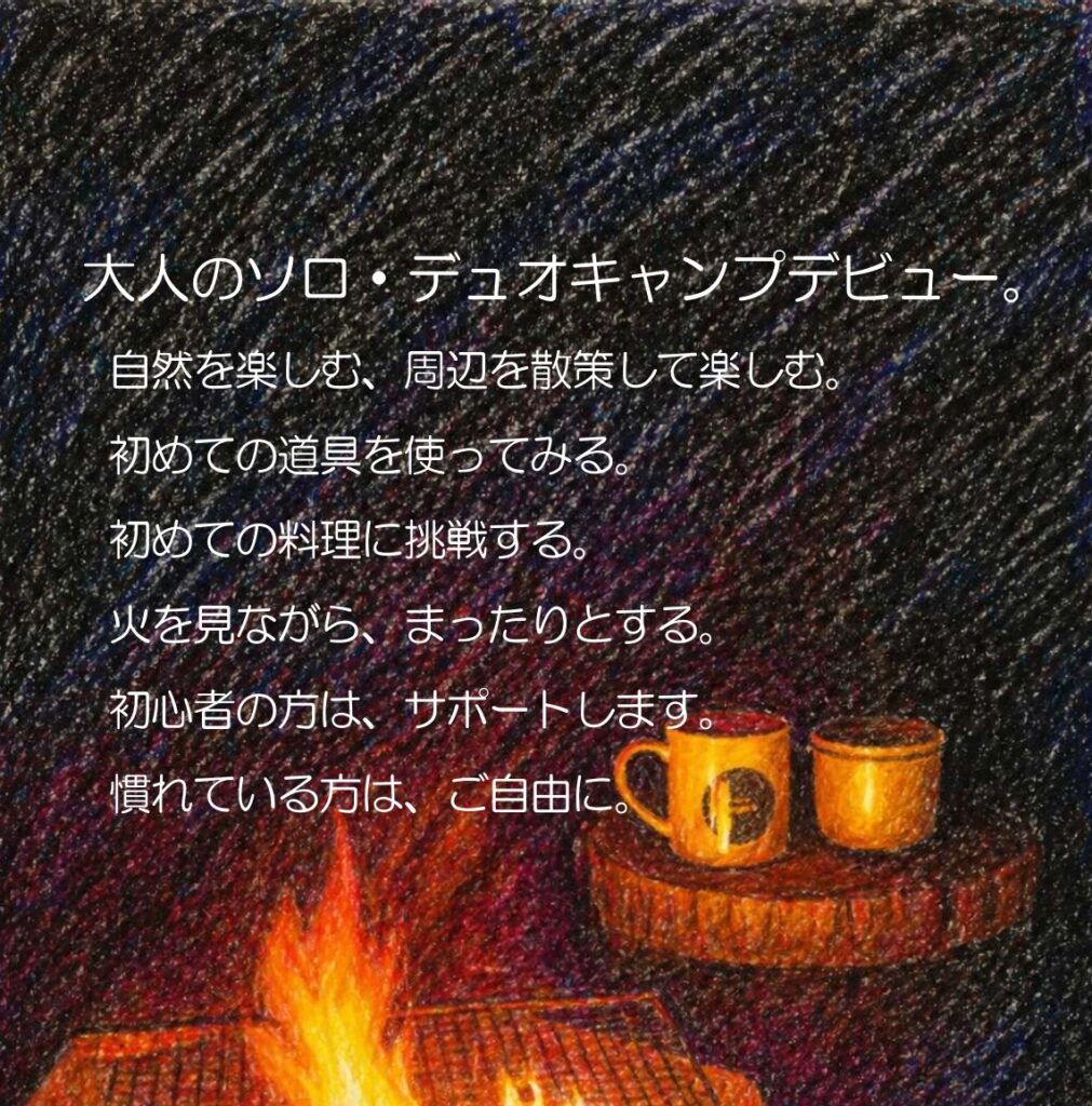 | 参加費 | 1人 4,000円(保険代含む) 追加1名 3,000円 ※テントや寝袋のレンタルは別料金をいただきます。 |
