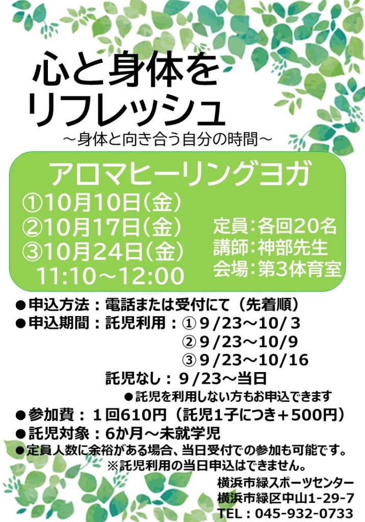 申込期間 申込方法 | 託児利用の方: 10/10(金):9/23(火)~10/3(金) 10/17(金):9/23(火)~10/9(木) 10/24(金):9/23(火)~10/16(木) 託児なしの方:9/23(火)~各回当日 電話(045-932-0733)または来館 |