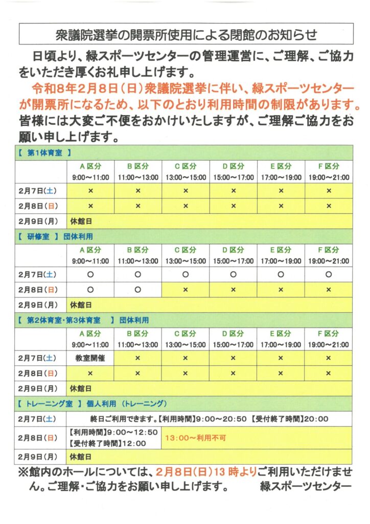 【重要】2月8日 衆議院選挙に伴う施設の利用スケジュールについて