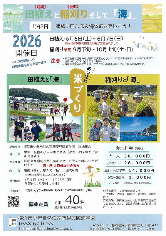 | 料金に含まれるもの | 宿泊費(夕食1回、朝食1回、昼食1回、シーツ代、寝具使用料、水道光熱費)、体験費(カヤック、ライフジャケットレンタル代)、田んぼ体験料、飲料(本数はプログラムにより異なります)、保険代、その他各プログラムで使用するもの。最終日の昼食は地元(南伊豆町)の地元の方たちとご飯(懇親会)。 ※1家族に5kg程度のお米をお送りします。 |