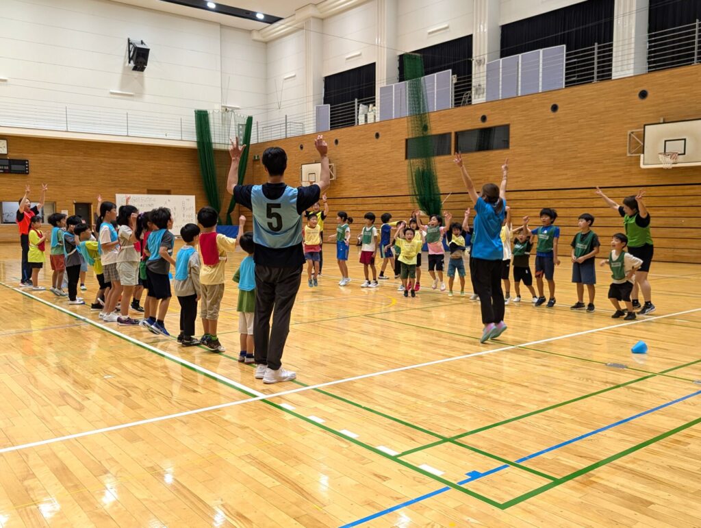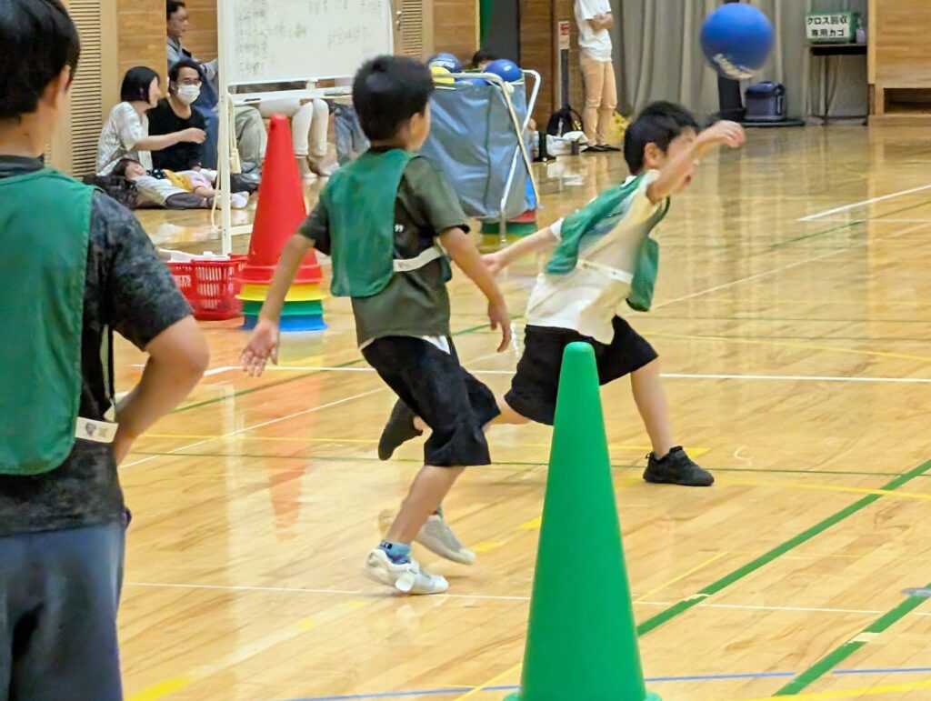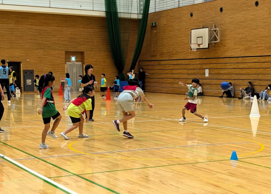 ボールの投げ方から、集まったみんなとチームを作ってゲームまで!ひろ~い体育館の中で全力で楽しめるプログラム。ボールを見ながら逃げる練習、向きを変えてすぐにボールを投げる練習等をしてゲーム総当たり戦を行いました。