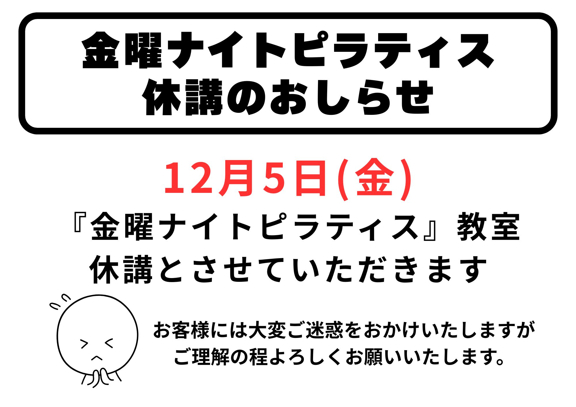 12/5(金)開催予定でした当日受付教室『金曜ナイトピラティス』は、諸事情のため休講となります。
