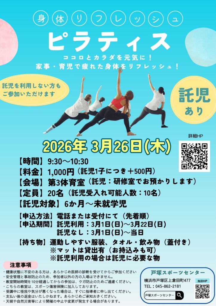 身体リフレッシュピラティス(託児付き)教室を開催します!