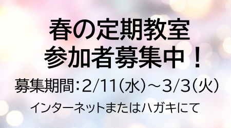 2026年度 春の教室【4月から6月】を下記日程にて募集します。定員を上回る場合は、抽選となりますのでご了承ください。