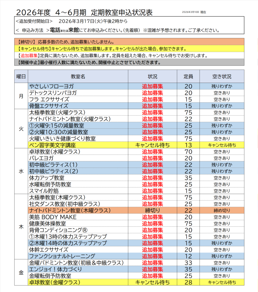 4~6月に開催する『春の定期教室』の追加募集についてのご案内をいたします。