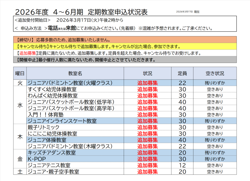 春の定期教室の追加募集は3月17日(火)14時00分より受付いたします。
