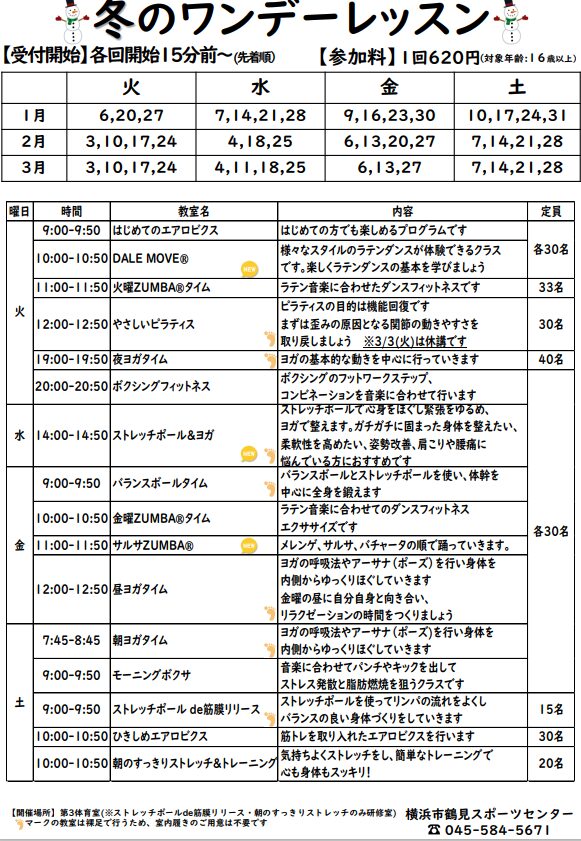 2025年度 冬の教室【1月から3月】を下記日程にて募集します。定員を上回る場合は、抽選となりますのでご了承ください。