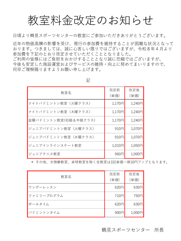 近年の物価高騰の影響を受け、教室料金を維持することが困難となってまいりました。