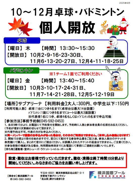 当施設では、卓球・バドミントンを個人利用としてご利用いただけます。