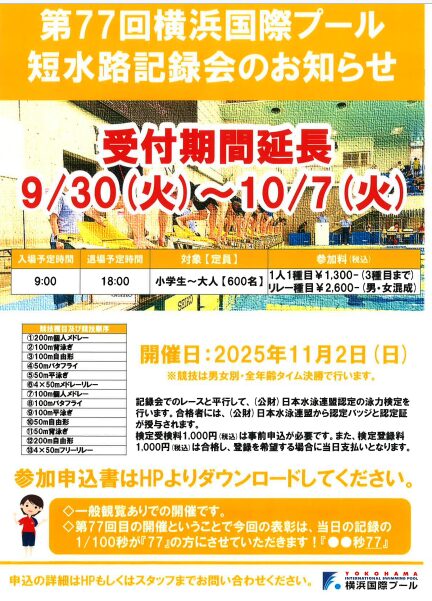 第77回横浜国際プール短水路記録会兼泳力検定会の申し込み期間を延長いたします。