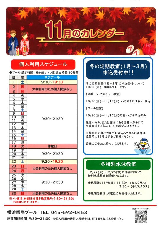 11月度のプール・トレーニング室の個人利用可能日程及びイベントカレンダーをお知らせいたします。