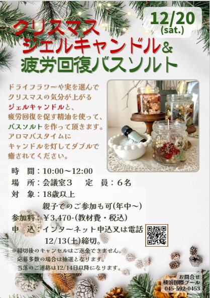 【お知らせ】12/20(土) 単発教室「クリスマスジェルキャンドル&疲労回復バスソルトづくり」を開催します