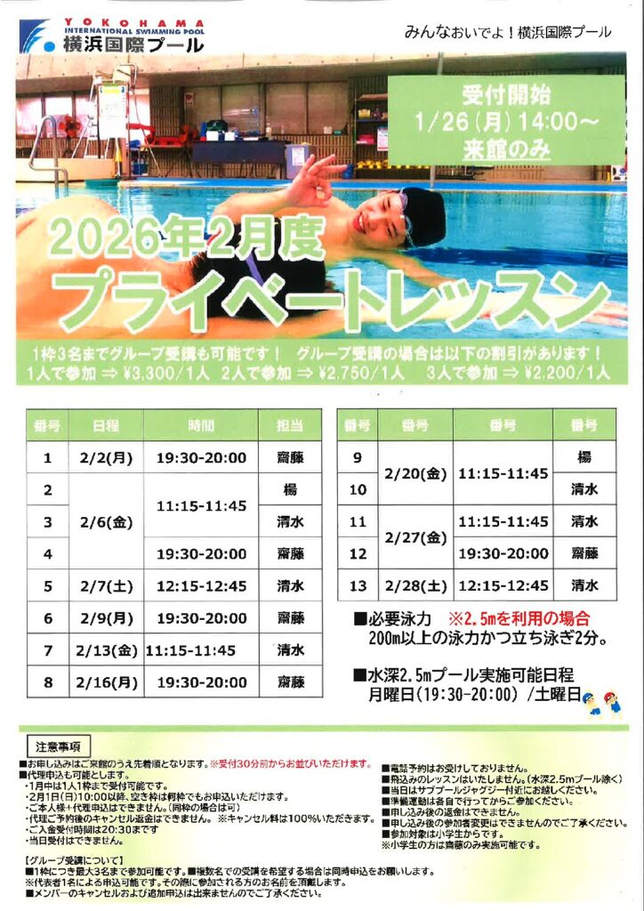 2026年2月度のプライベートレッスンの日程をお知らせいたします。