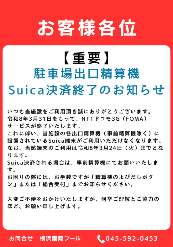 これに伴い、当施設の駐車場精算機(事前精算機除く)に設置されているSuica端末がご利用いただけなくなります。