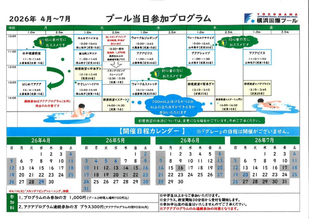 「4月~7月のプール当日参加プログラム」のスケジュールをご案内いたします。