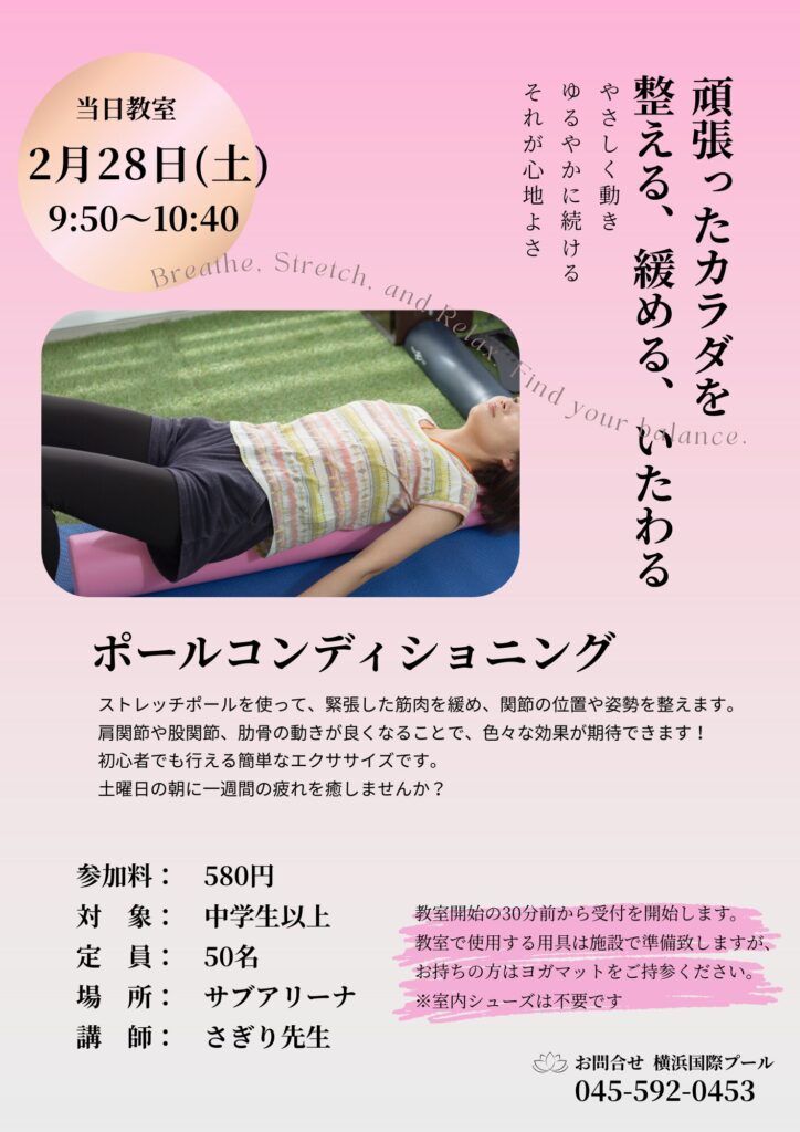 【お知らせ】2月28日 当日教室「ポールコンディショニング」を開催します。