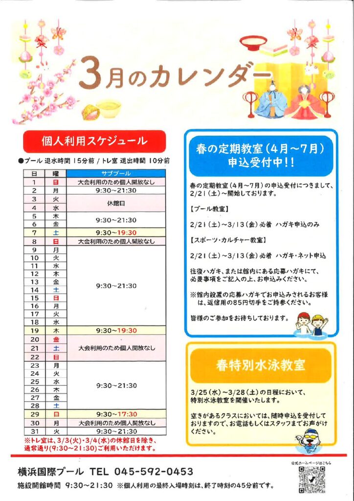 【お知らせ】2026年3月度のプライベートレッスン(スイミング)のお知らせ