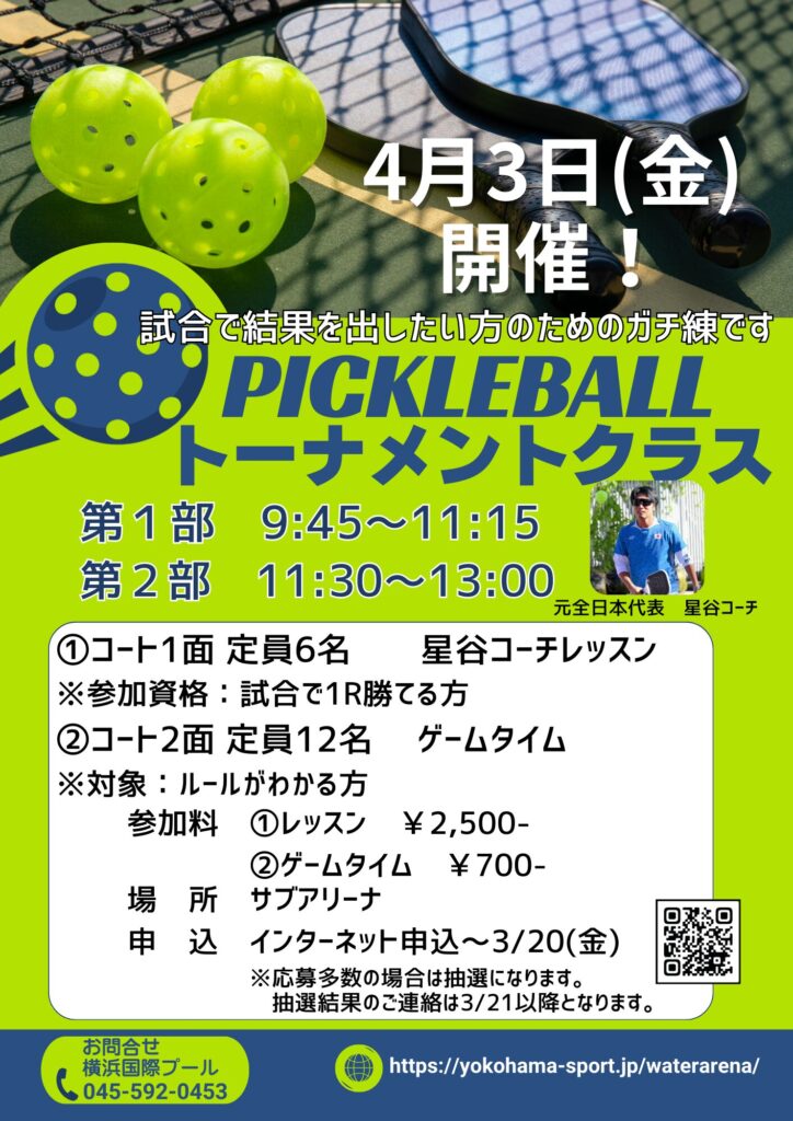 4月3日(金)「ピックルボール 星谷コーチレッスン&ゲームタイム」のお知らせ